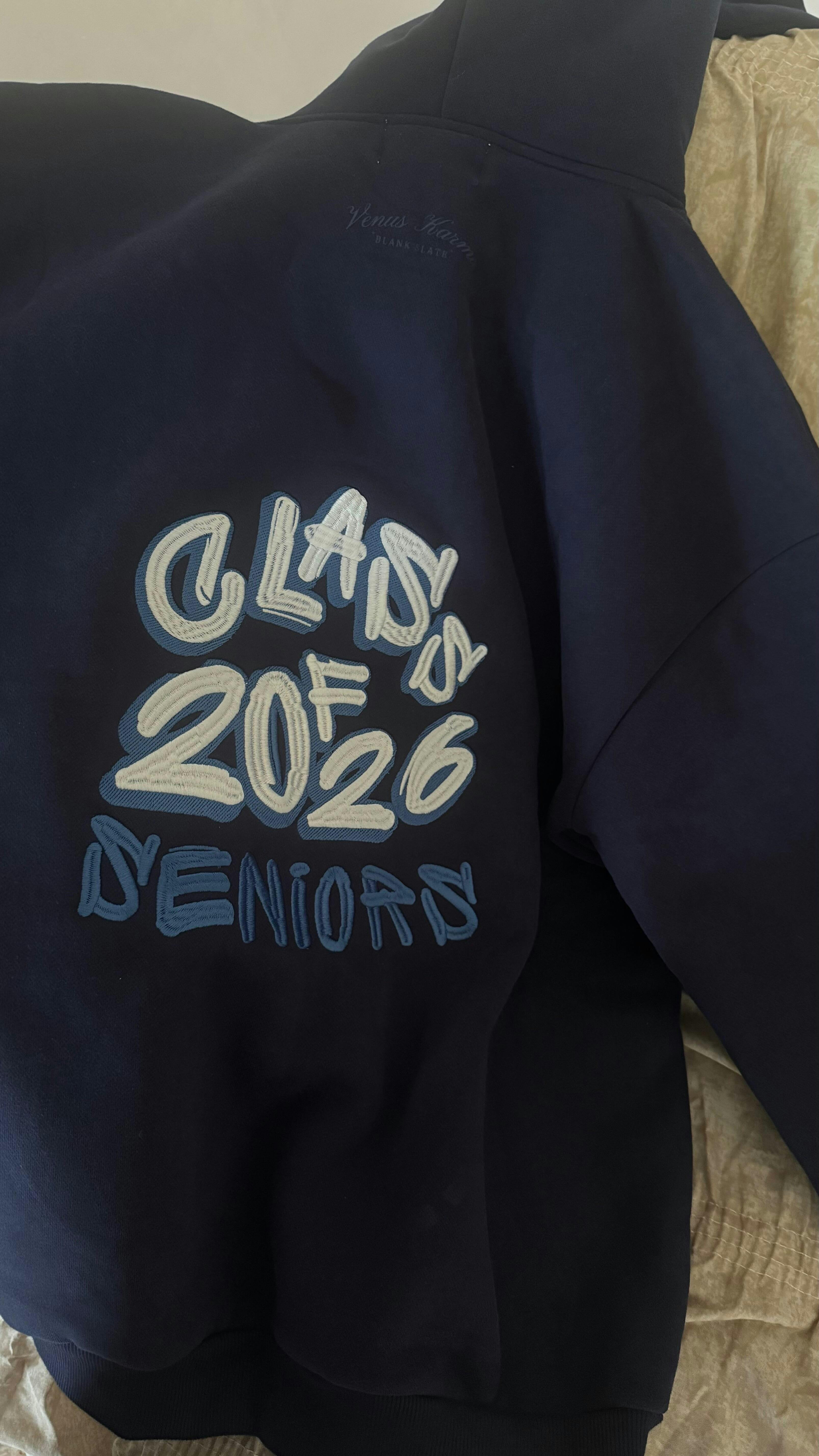 I ordered 44 hoodies for my grade because we are seniors. The quality is amazing, inside and out. Thick material and clean stitching. It is definitely top notch. Im genuinely impressed with the packaging. It was very neat and protective and organized, perfectly folded ready to wear hoodies. Delivery was effortless and quick. Customer support was good. They responded quickly and made sure it was exactly how we wanted it. Professional and Personalized.